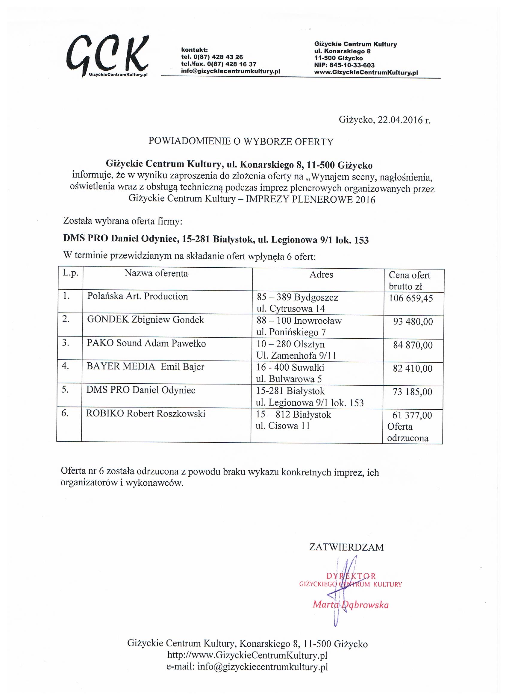 wybór najkorzystniejszej oferty zostanie ogłoszony na stronie www.gizyckiecentrumkultury.pl