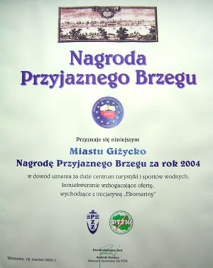 Podczas Targów Żeglarskich „Wiatr i woda” w Warszawie12 marca 2005r. burmistrz Giżycka Jolanta Piotrowska odebrała „Nagrodę Przyjaznego Brzegu za rok 2004”.